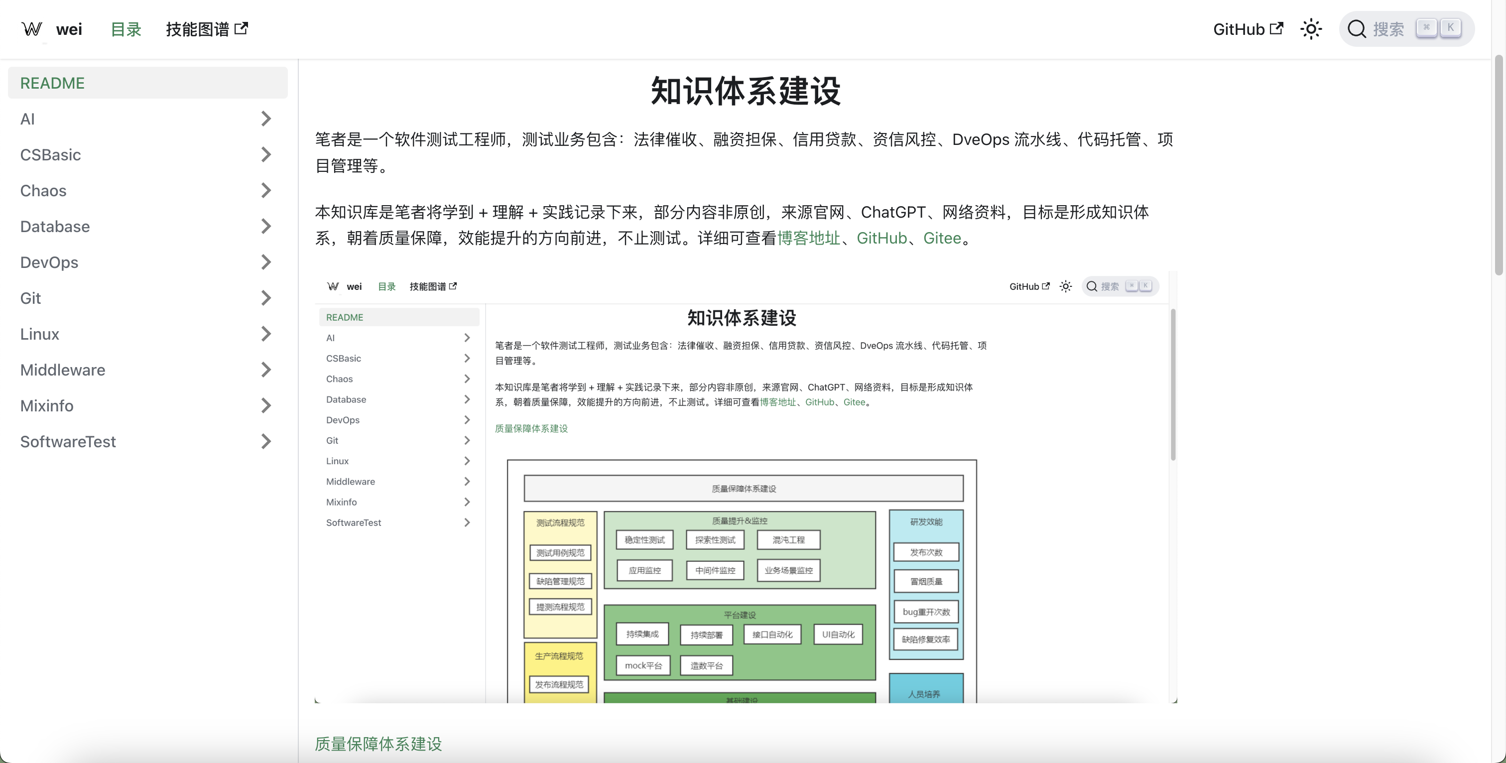READMEREADME[TOC]知识体系建设笔者是一个软件测试工程师,测试业务包含:法律催收、融资担保、信用贷款、资信风控、DveOps 流水线、代码托管、项目管理等。本知识库是笔者将学到 + 理解 + 实践记录下来,部分内容非原创,来源官网、ChatGPT、网络资料,目标是形成知识体系,朝着质量保障,效能提升的方向前进,不止测试。详细可查看博客地址、GitHub、Gitee。质量保障体系建设测试工程师技能图谱